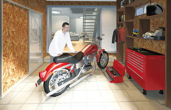 パパが大事にしている愛車のバイクの整備にも最適。雨風から愛車を守れ、リビングからいつでも眺められます。