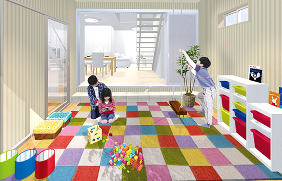 ママが家事をしながら見守れる、広々としたキッズスペース。