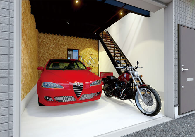 1階は、趣味のための道具や機材を運ぶ車を停められるシャッター付きガレージスペース。大切な愛車やバイクを雨や風から守り、セキュリティシステムが監視、盗難を防いで、ゆっくりと手入れや整備ができます。