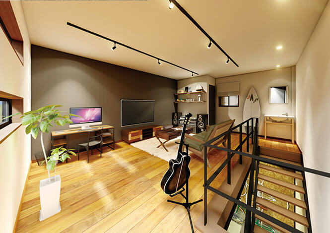 ガレージの上は、自分の好きな趣味のために使える自由なプライベート空間です。24時間快適に過ごせるエアコンとトイレ、洗面設備を備えて、時間を忘れて没頭できます。もちろんインターネットも無料で利用できるので、ここから世界へ発信するクリエイティブな拠点にもなります。