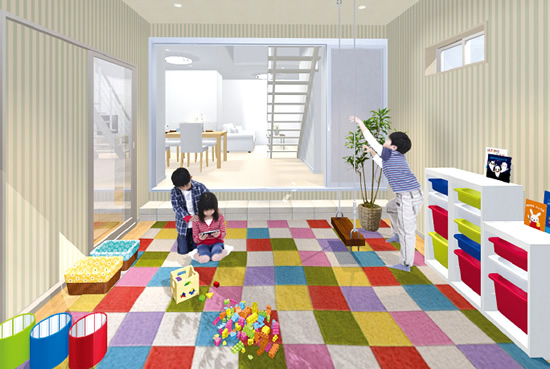 ママが家事をしながら見守れる、広々としたキッズスペース。 ご近所のお友達も一緒にのびのび遊べます。