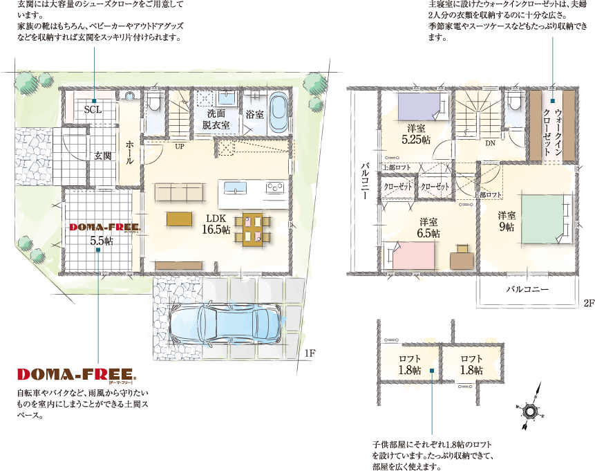 どちらも自宅にいながらオープン感覚が楽しめる開放感と拡張性にあふれるアイデア設計です。たっぷりの収納設備も随所に設置しました。